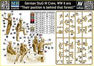 Master Box 35208 1/35 German StuG III Crew, WWII. "Their position is behind that forest!". This kit includes parts for the assembly of five figures. The set requires both glue and paint in order to be completed. Paints and glue are not included. For modelers aged 14 and older