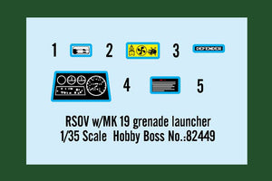Hobby Boss 82449 1/35 scale RSOV with MK 19 Grenade Launcher. This kit includes parts for the assembly of one plastic model kit. The set requires both glue and paint in order to be completed. Paints and glue are not included. For modelers aged 14 and older