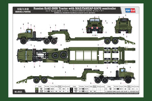 Hobby Boss 85523 1/35 scale Russian KrAZ-260B Tractor with MAZ/ChMZAP-5247G Semitrailer. This kit includes parts for the assembly of one plastic model kit. The set requires both glue and paint in order to be completed. Paints and glue are not included. For modelers aged 14 and older