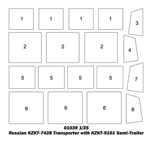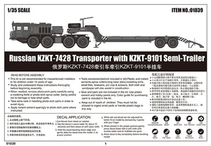 Trumpeter 1039 1/35 scale Russian KZKT-7428 Transporter with KZKT-9101 Semi-Trailer. This kit includes parts for the assembly of one plastic model kit. The set requires both glue and paint in order to be completed. Paints and glue are not included. For modelers aged 14 and older