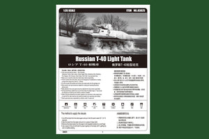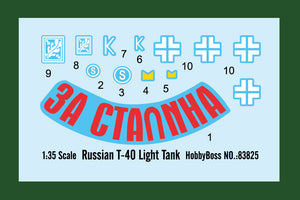 Hobby Boss 83825 1/35 scale Russian T40 Light Tank. This kit includes parts for the assembly of one plastic model kit. The set requires both glue and paint in order to be completed. Paints and glue are not included. For modelers aged 14 and older