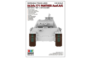 Rye Field Models 5014 1/35 Workable Track Links For Panther Ausf.A/G. This kit includes parts for the assembly of one plastic model kit. The set requires both glue and paint in order to be completed. Paints and glue are not included. For modelers aged 14 and older