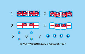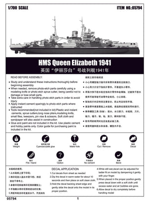 Trumpeter 5794 1/700 scale HMS Queen Elizabeth 1941. This kit includes parts for the assembly of one plastic model kit. The set requires both glue and paint in order to be completed. Paints and glue are not included. For modelers aged 14 and older