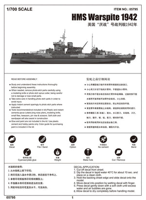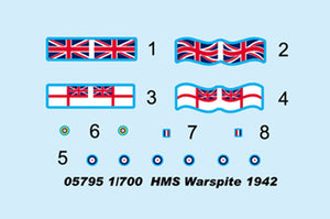 Trumpeter 5795 1/700 scale HMS Warspite 1942. This kit includes parts for the assembly of one plastic model kit. The set requires both glue and paint in order to be completed. Paints and glue are not included. For modelers aged 14 and older