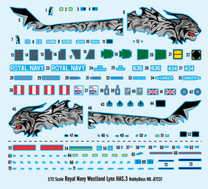 Hobby Boss 87237 1/72 scale Royal Navy Westland Lynx HAS.3. This kit includes parts for the assembly of one plastic model kit. The set requires both glue and paint in order to be completed. Paints and glue are not included. For modelers aged 14 and older