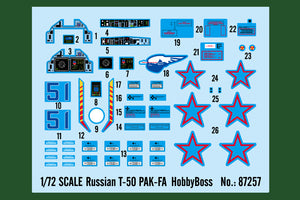 Hobby Boss 87257 1/72 scale Russian T50 PAK-FA. This kit includes parts for the assembly of one plastic model kit. The set requires both glue and paint in order to be completed. Paints and glue are not included. For modelers aged 14 and older