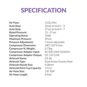 Small but powerful: Despite its compact size, the compressor boasts 7 pressure levels and a maximum air pressure output of 27 PSI, giving you the versatility to handle all your airbrush modeling needs.