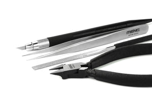 This product includes: MTS-006 Basic side cutters *1pc, MTS-007 Basic hobby knife *1pc (incl. 12 spare blades with a 30 degree angle), MTS-008 Basic flat file*1pc, MTS-009 Tweezers *1pc, Leather tool bag *1pc