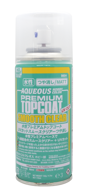 B523 UV Cut Flat: Many modelers have had the experience of not only direct ultraviolet light from the sun but also indoor sources such as fluorescent light fading the paint on their projects. Mr. SUPER CLEAR UV CUT series is a special clear coating that reduces the effects of ultraviolet light. Use this coating to preserve your long hours of painting. (This product is made especially for the Mr. Color series and cannot be used over water-based paints and decals.)
